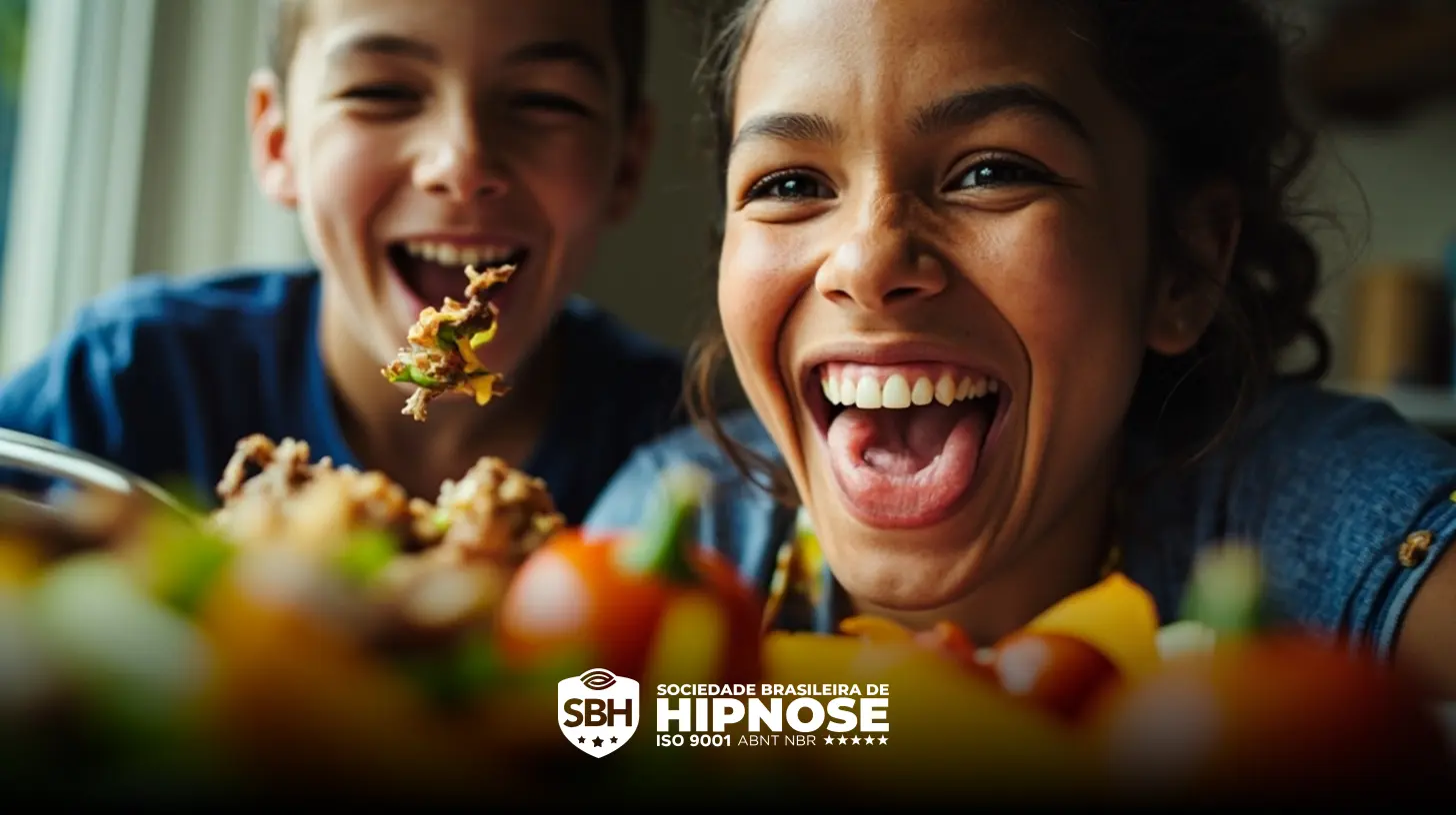 Duas crianças sorrindo e comendo uma refeição colorida, com o logotipo da Sociedade Brasileira de Hipnose exibido na parte inferior da imagem.