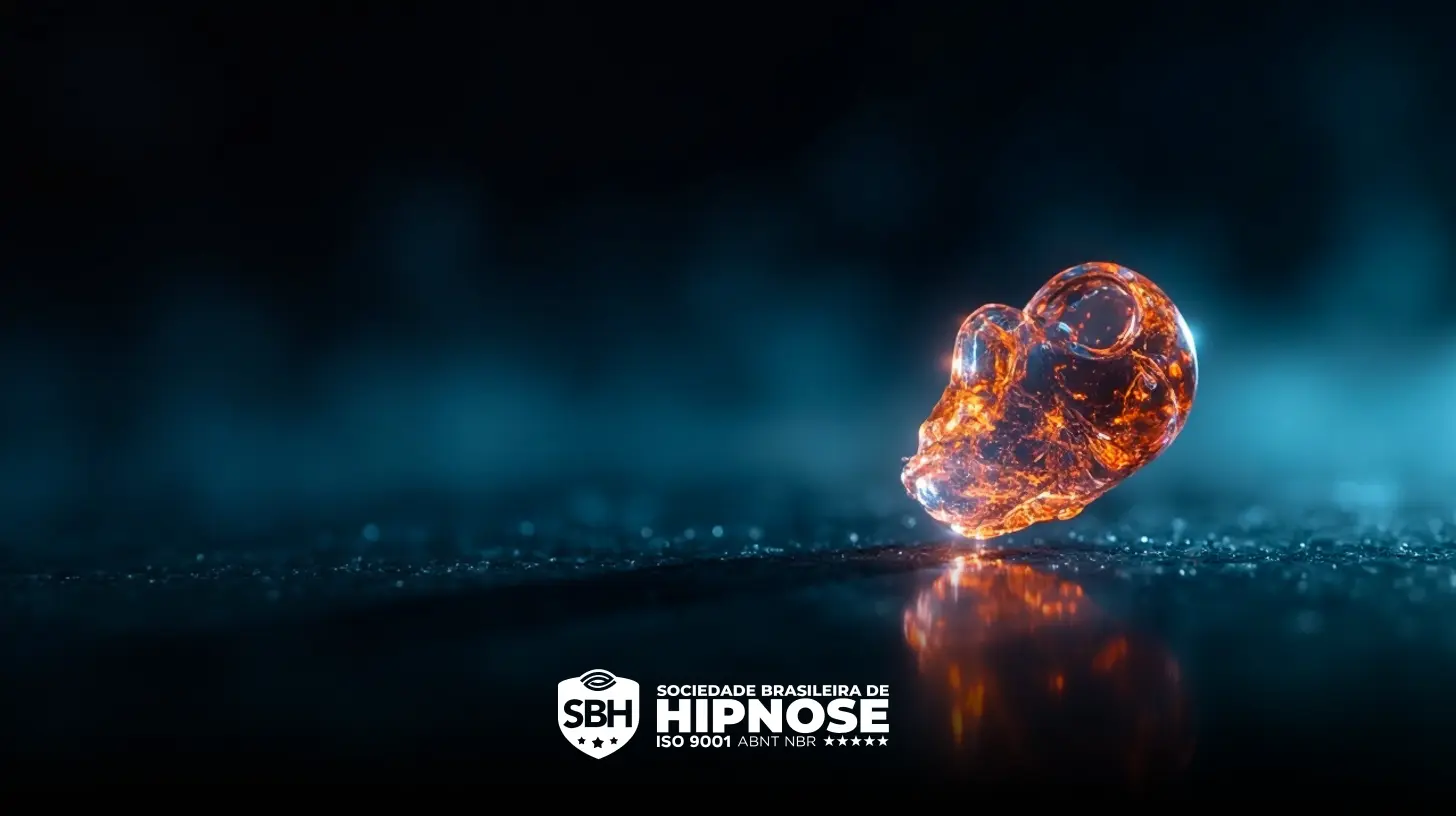 Uma estatueta de caveira laranja, pequena e transparente, repousa sobre uma superfície refletora com um fundo azul e preto desfocado. O logotipo da Sociedade Brasileira de Hipnose aparece na parte inferior.