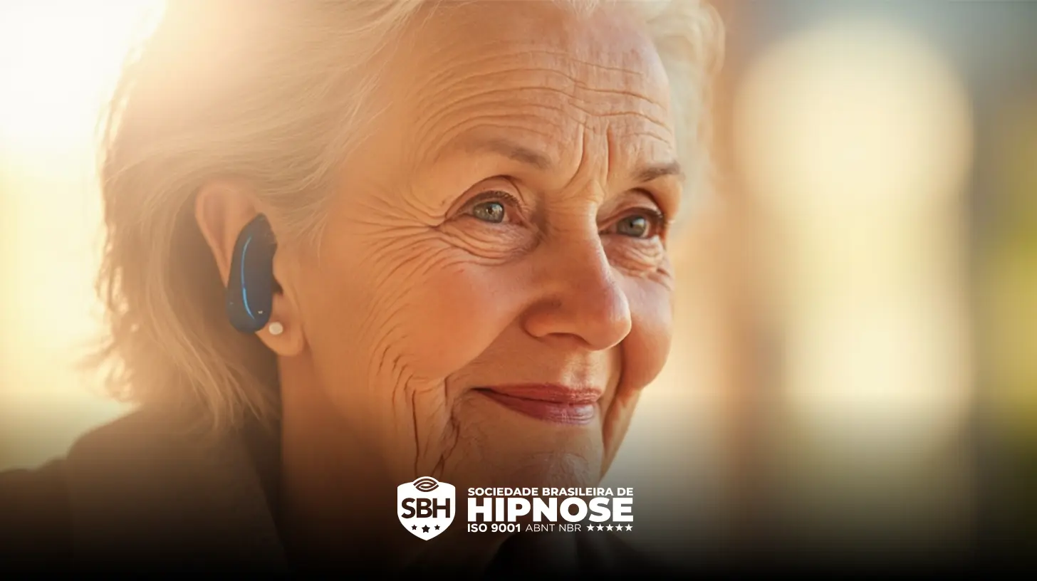 Mulher idosa sorrindo e usando um fone de ouvido sem fio, com o logotipo da Sociedade Brasileira de Hipnose e o texto de certificação na parte inferior da imagem.