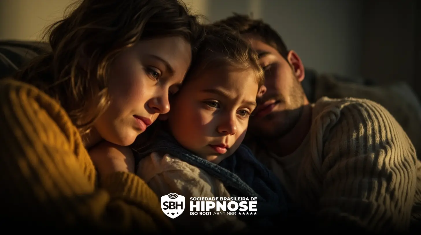 Uma mulher, uma criança e um homem sentados juntos em um sofá, parecendo sérios. O logotipo da Sociedade Brasileira de Hipnose é exibido na parte inferior da imagem.