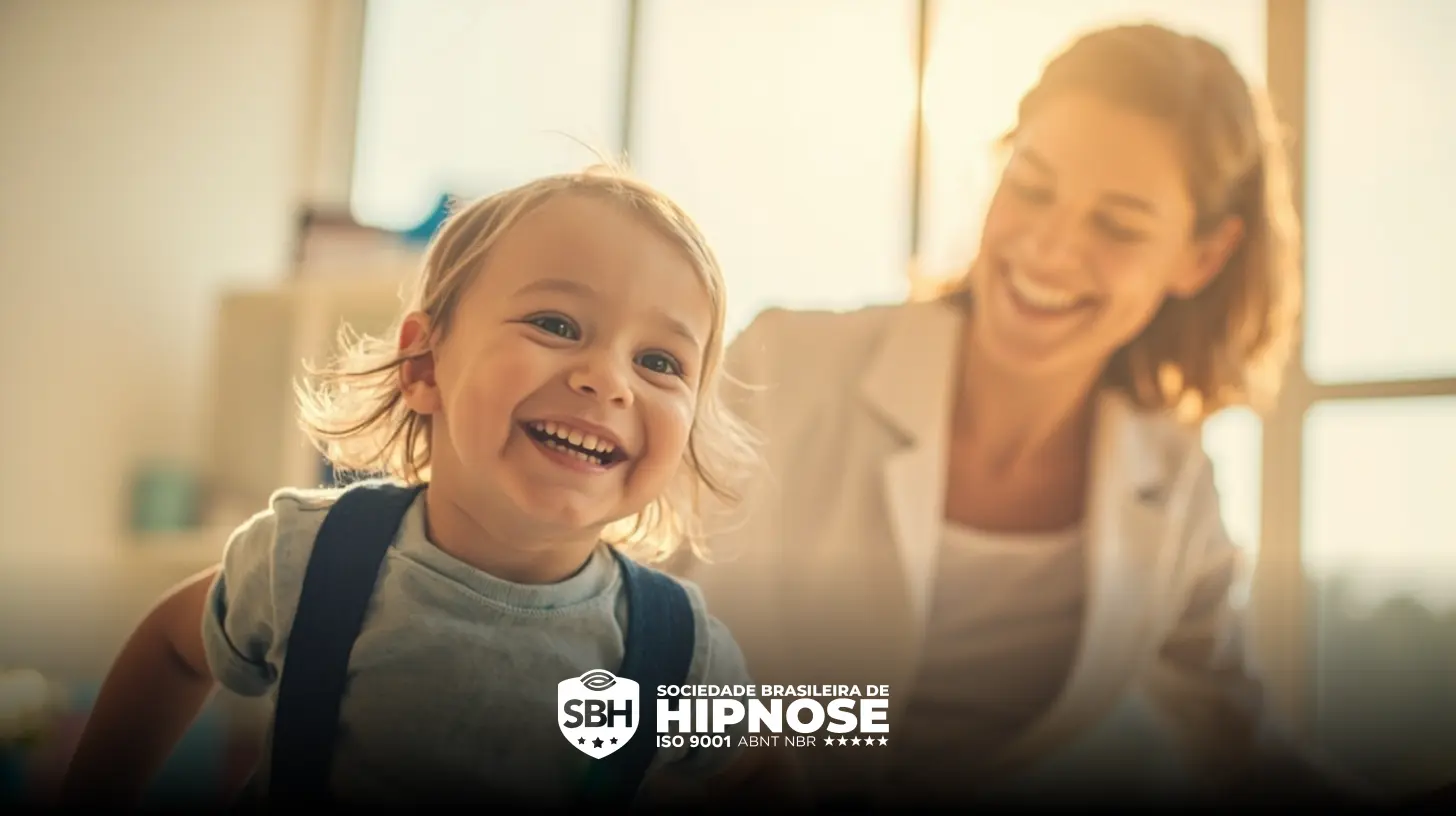 Criança sorridente em primeiro plano com uma mulher ao fundo, ambas em uma sala iluminada. O logotipo da "Sociedade Brasileira de Hipnose" é exibido na parte inferior.