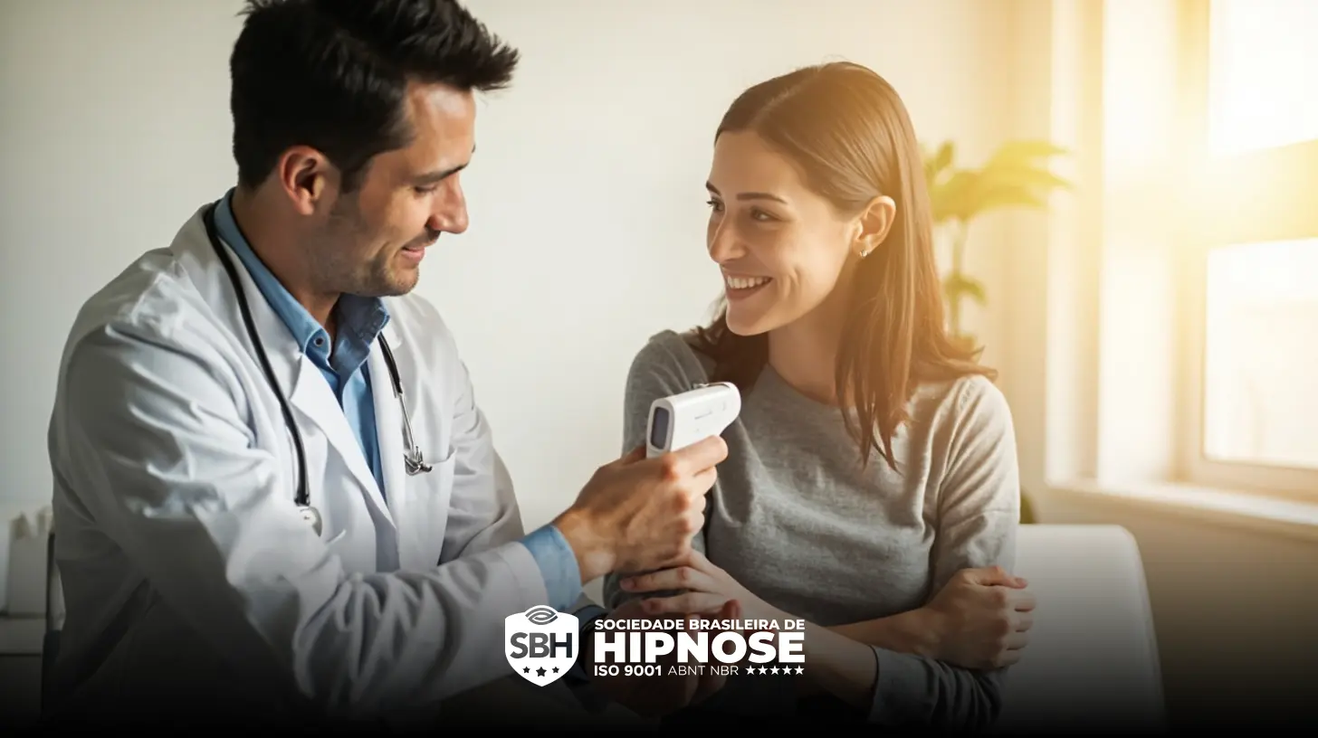 Um médico segura um termômetro na testa de uma mulher sorridente em um consultório médico. O logotipo da Sociedade Brasileira de Hipnose aparece na parte inferior da imagem.