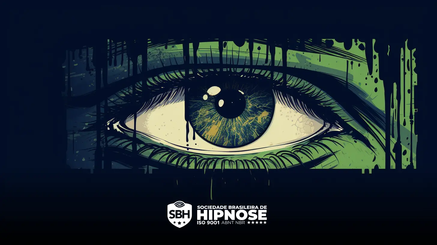 Gráfico ilustrativo de olho grande e detalhado simbolizando inveja sobre fundo estampado verde e azul com logo da sociedade brasileira de hipnose.