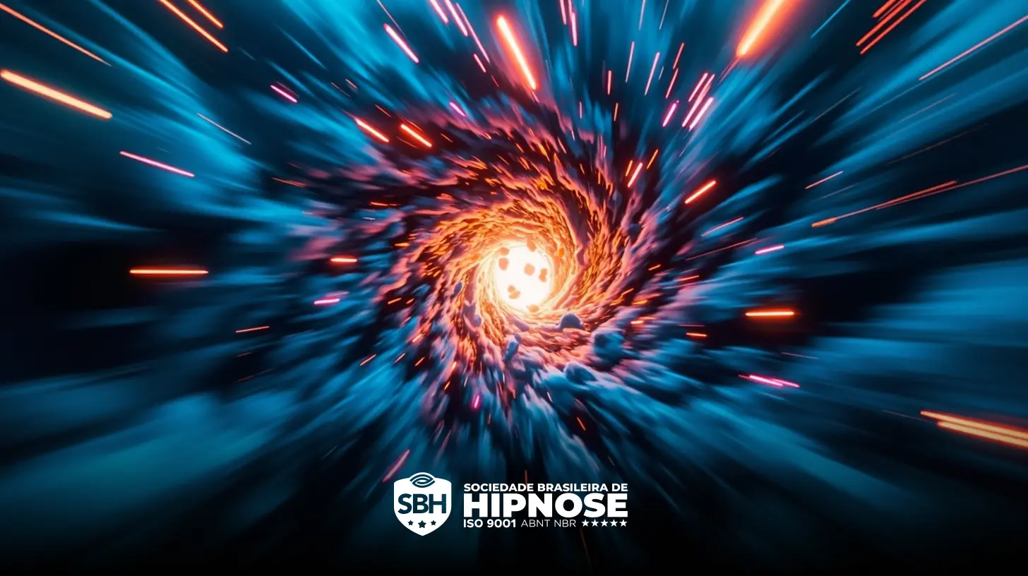Um vórtice giratório de luzes azuis e laranja com um centro brilhante, apresentando o logotipo da Sociedade Brasileira de Hipnose e o texto de certificação na parte inferior.