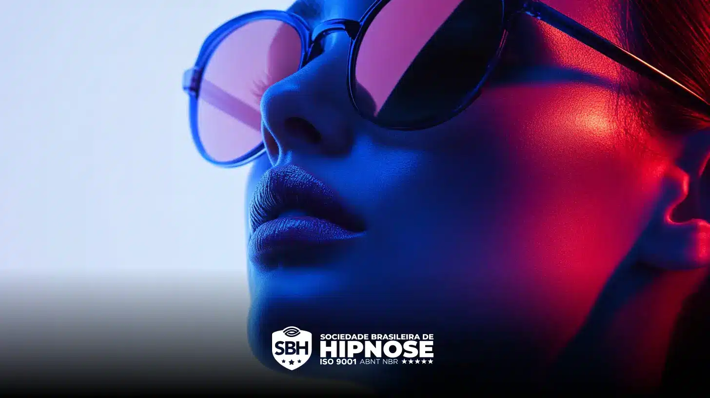 Close de uma pessoa usando óculos escuros, iluminada por iluminação azul e vermelha. O logotipo da Sociedade Brasileira de Hipnose é exibido na parte inferior da imagem.