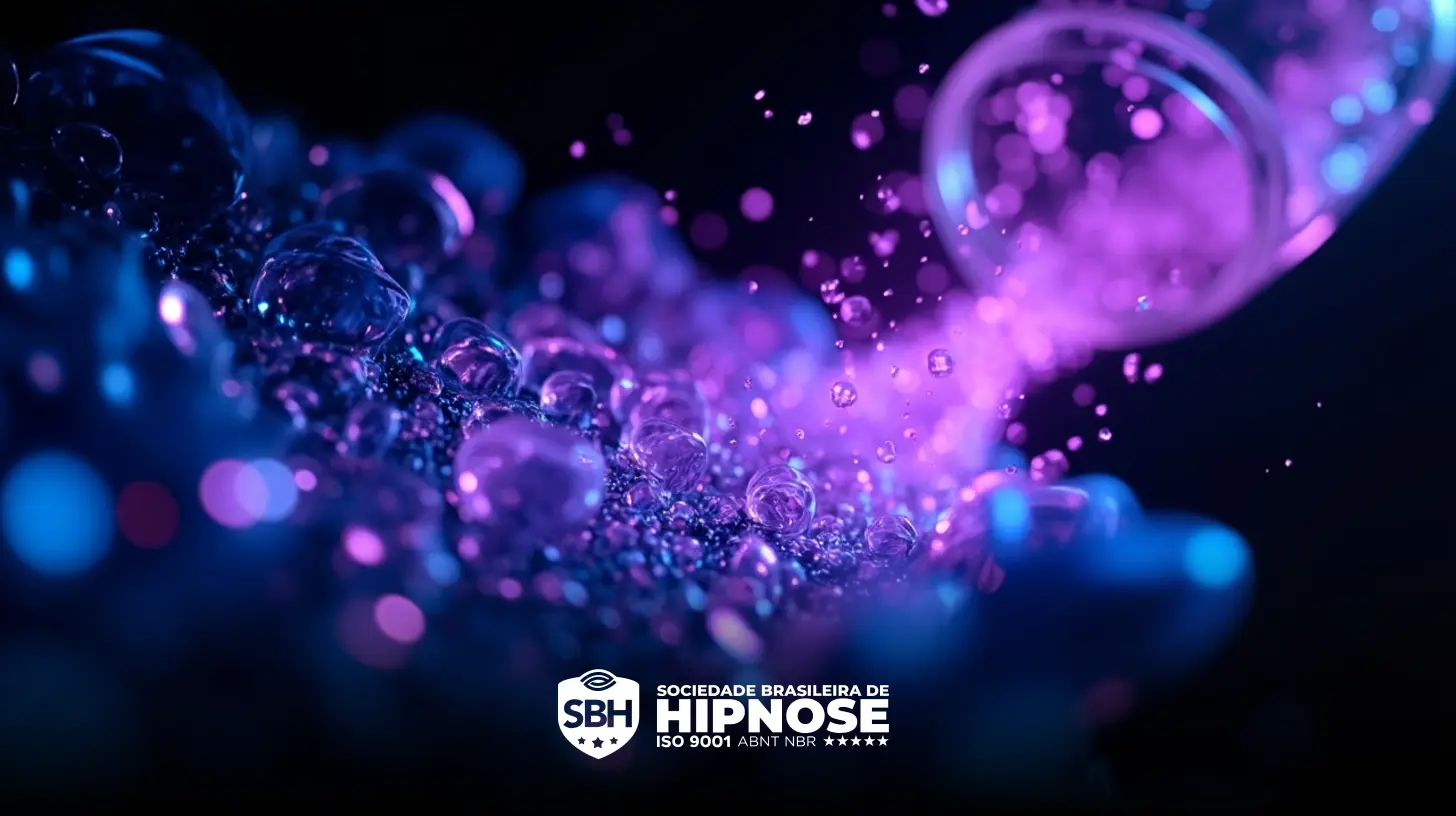 Um fluxo de líquido roxo brilhante é derramado de um recipiente em uma superfície com bolhas translúcidas, com o logotipo da Sociedade Brasileira de Hipnose na parte inferior.