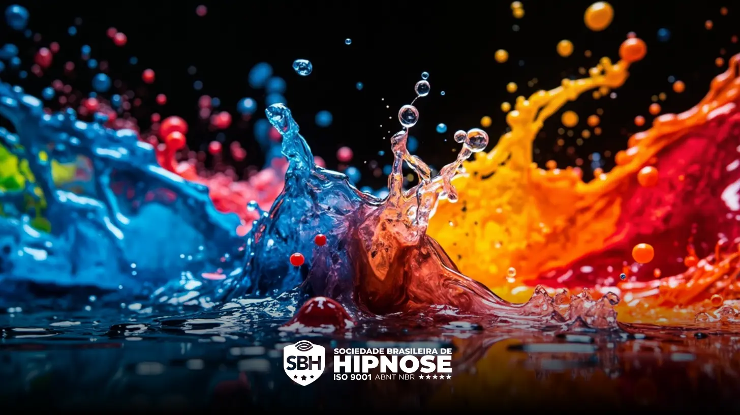 Salpicos de tinta azul, vermelha e amarela se chocam contra um fundo preto, criando uma cena dinâmica e colorida. O logotipo da Sociedade Brasileira de Hipnose está visível na parte inferior.