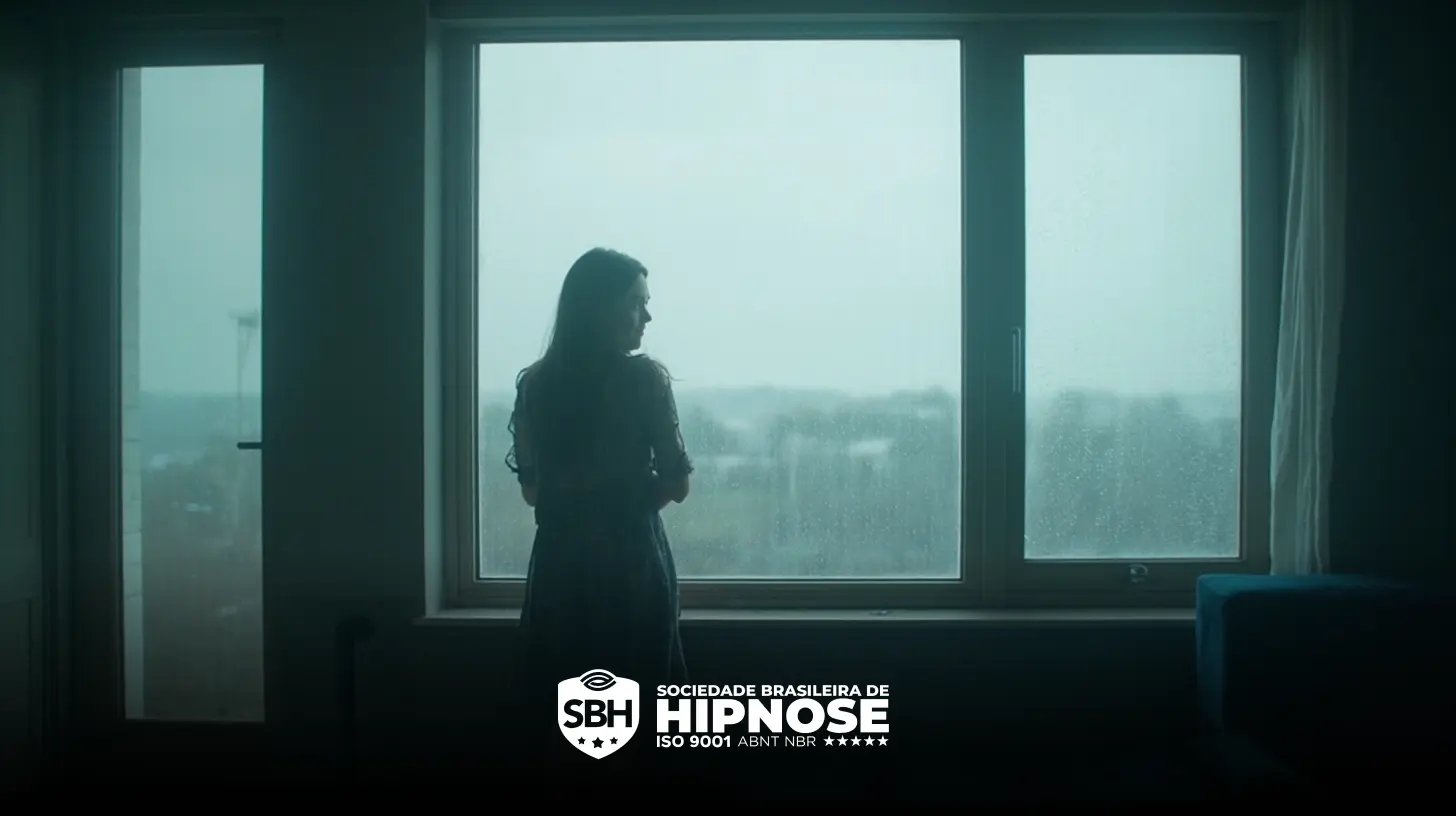 Uma mulher em pé ao lado de uma grande janela olhando para fora em um dia nublado. O logotipo da Sociedade Brasileira de Hipnose aparece na parte inferior da imagem.