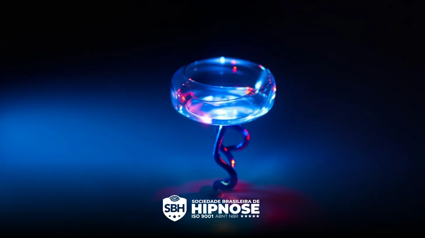 Um objeto de vidro com uma haste em espiral é iluminado por luzes azuis e vermelhas em um fundo escuro. O logotipo da Sociedade Brasileira de Hipnose está visível na parte inferior.