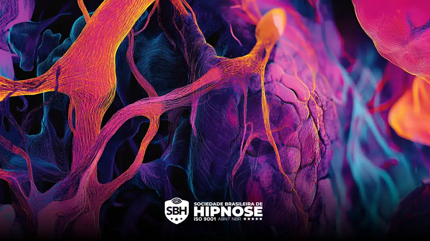 Arte digital abstrata apresentando estruturas vibrantes e entrelaçadas semelhantes a neurais em tons de laranja e roxo. O texto na parte inferior diz: "Sociedade Brasileira de Hipnose ISO 9001 ABNT NBR.