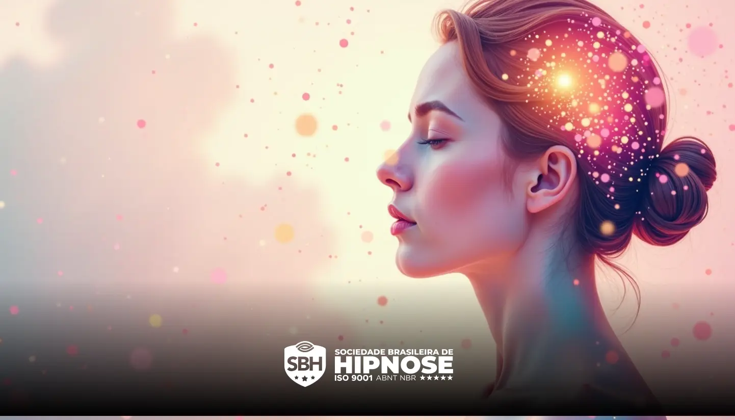 Perfil de uma mulher com olhos fechados cercados por partículas brilhantes, em um fundo desfocado. Logo da "Sociedade Brasileira de Hipnose" na parte inferior.