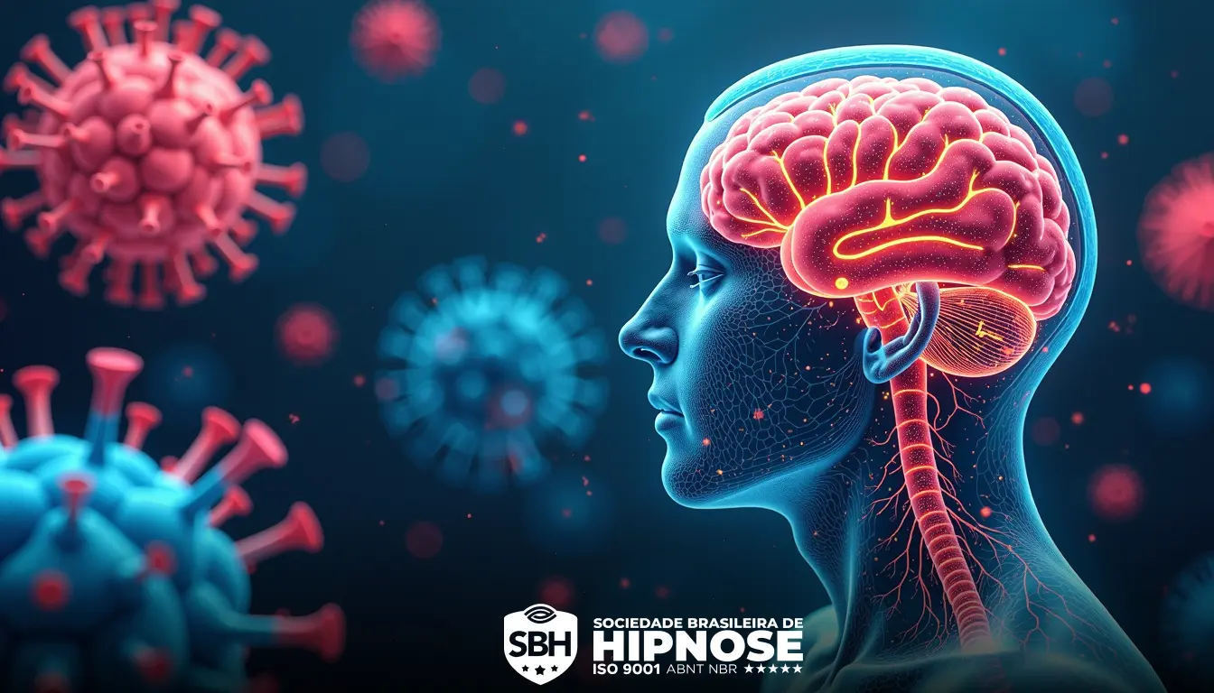 Ilustração de um perfil humano com um cérebro destacado cercado por células virais vermelhas e azuis, apresentando o logotipo da Sociedade Brasileira de Hipnose.