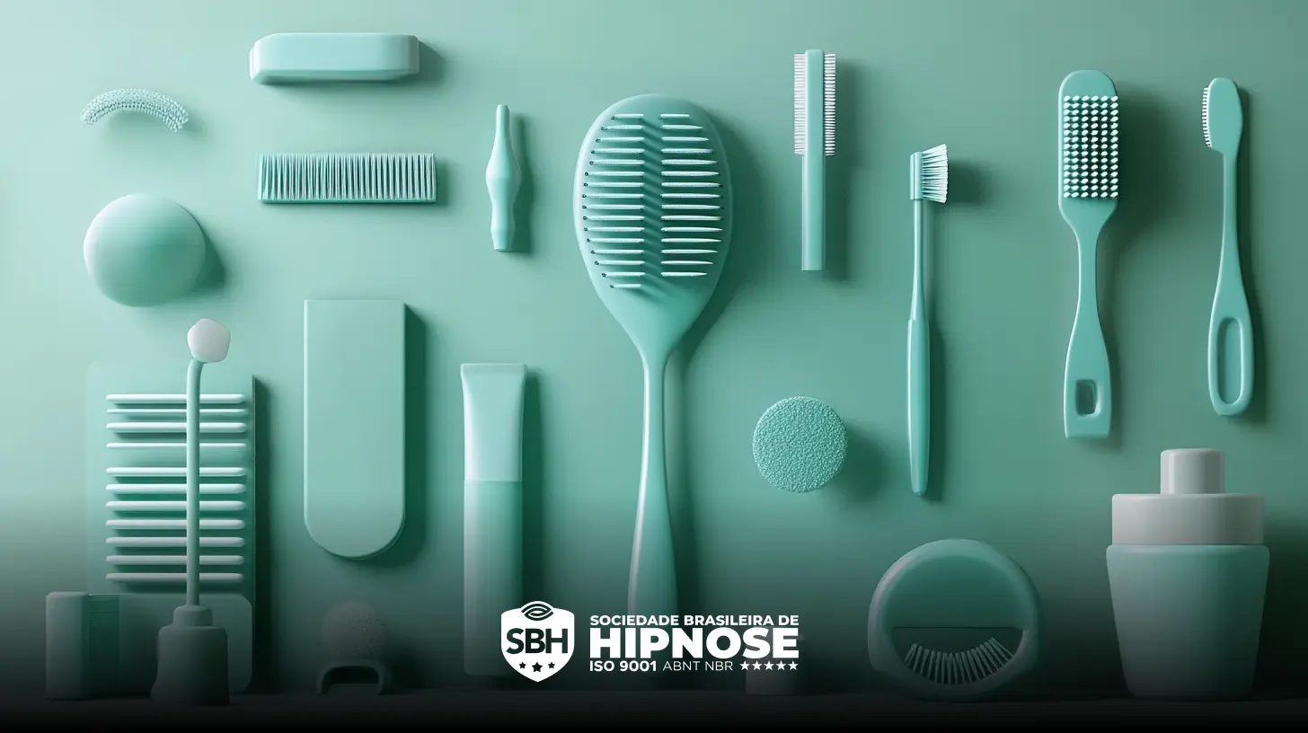 Acessórios de banheiro turquesa em uma superfície, incluindo escovas de dentes, uma escova de cabelo, um pente e produtos de higiene pessoal. Logotipo "SBH - Sociedade Brasileira de Hipnose" na parte inferior.
