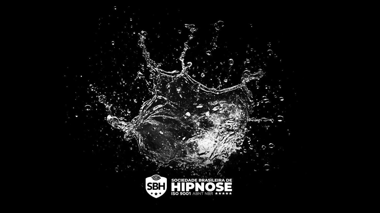 Respingo de água sobre fundo preto com logo e texto "SBH Sociedade Brasileira de Hipnose ISO 9001 ABNT INBR" na parte inferior.