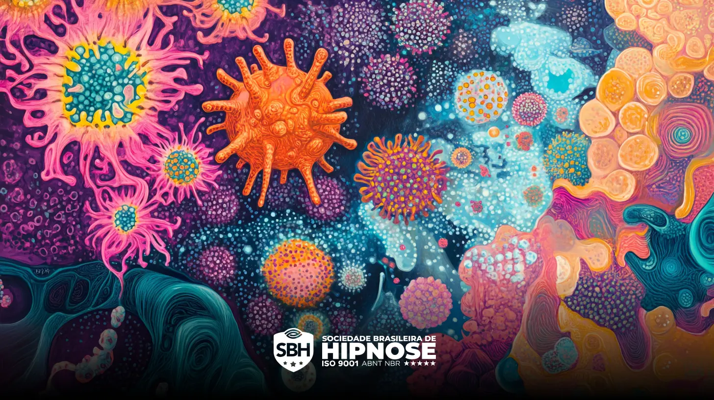 Ilustração colorida de várias formas e padrões abstratos e brilhantes semelhantes a vírus sobre um fundo escuro, com o logotipo da Sociedade Brasileira de Hipnose na parte inferior.